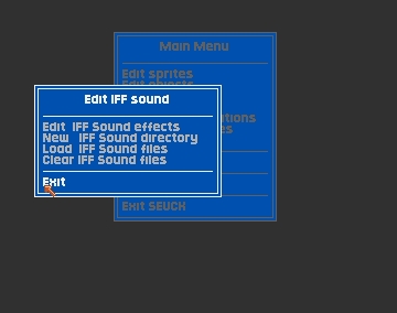 This menu allows you to load in and use IFF sound sample files to produce sound effects in your game. There are a total of three directories full of samples supplied with SEUCK. If this isn`t enough you can load your own disk of samples that you have created and work on effects with these.