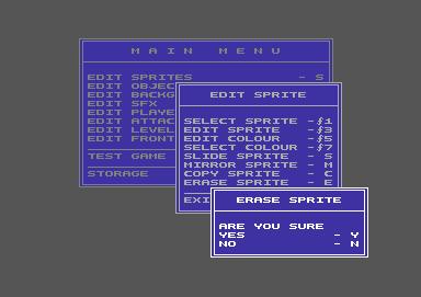 Designing a game starts with the main menu. From here the user selects one of nine editable features: sprites, backgrounds, objects, sound effects, player limitations, attack waves and levels to the character set and front end. Choosing one of these results in-a sub-menu appearing, which gives further options for the editor in operation.